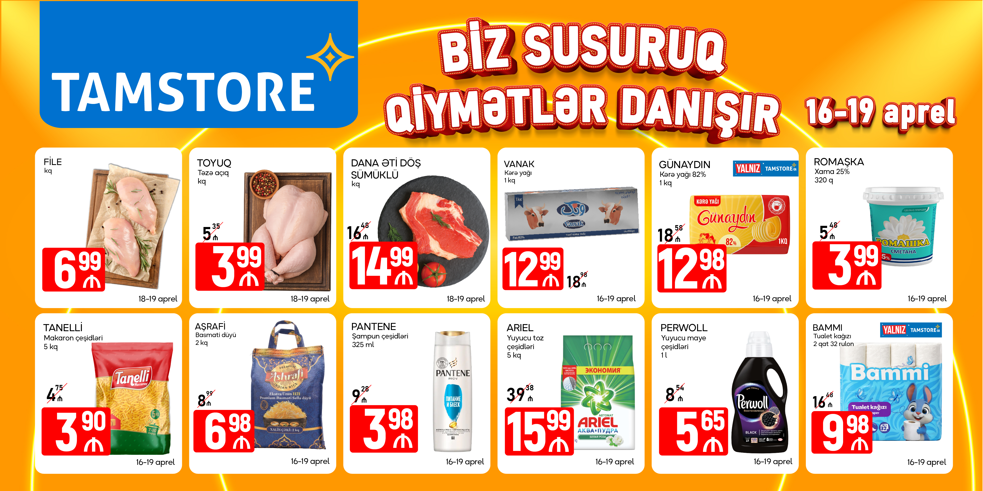 Tamstore Marketlər şəbəkəsi 16-19 aprel tarixlərində yenidən “Biz susuruq, qiymətlər danışacaq” kampaniyasına start verəcək. Kampaniya zamanı Vanak və Günaydın kərə yağları 12.99 manata, Romaşka xama 25 % 320 qramlıq 3.99 manata, 5 kilolouq Tanelli makaronu 3.90 manata, Əşrəfi basmati düyü kisə 2 kq 6.98 manata, Bammi tualet kağızı 32 rulon 9.99 manata, Pervol yuyucu maye 1 l 5.65 manata, Ariel yuyucu toz 5 kq 15.99 manata təklif olunacaq. Bundan başqa 18-19 aprel tarixlərində təzə toyuğun 1 kilosu 3.99 manat və sümüklü dana döş ətinin 1 kilosu 14.99 manat olacaq. Endirimlər təbii ki, bununla yekunlaşmır. Mağazada meyvə və tərəvəz maya dəyərinə, 2200 çeşiddə məhsul isə müxtəlif endirimlərlə təklif olunacaq.