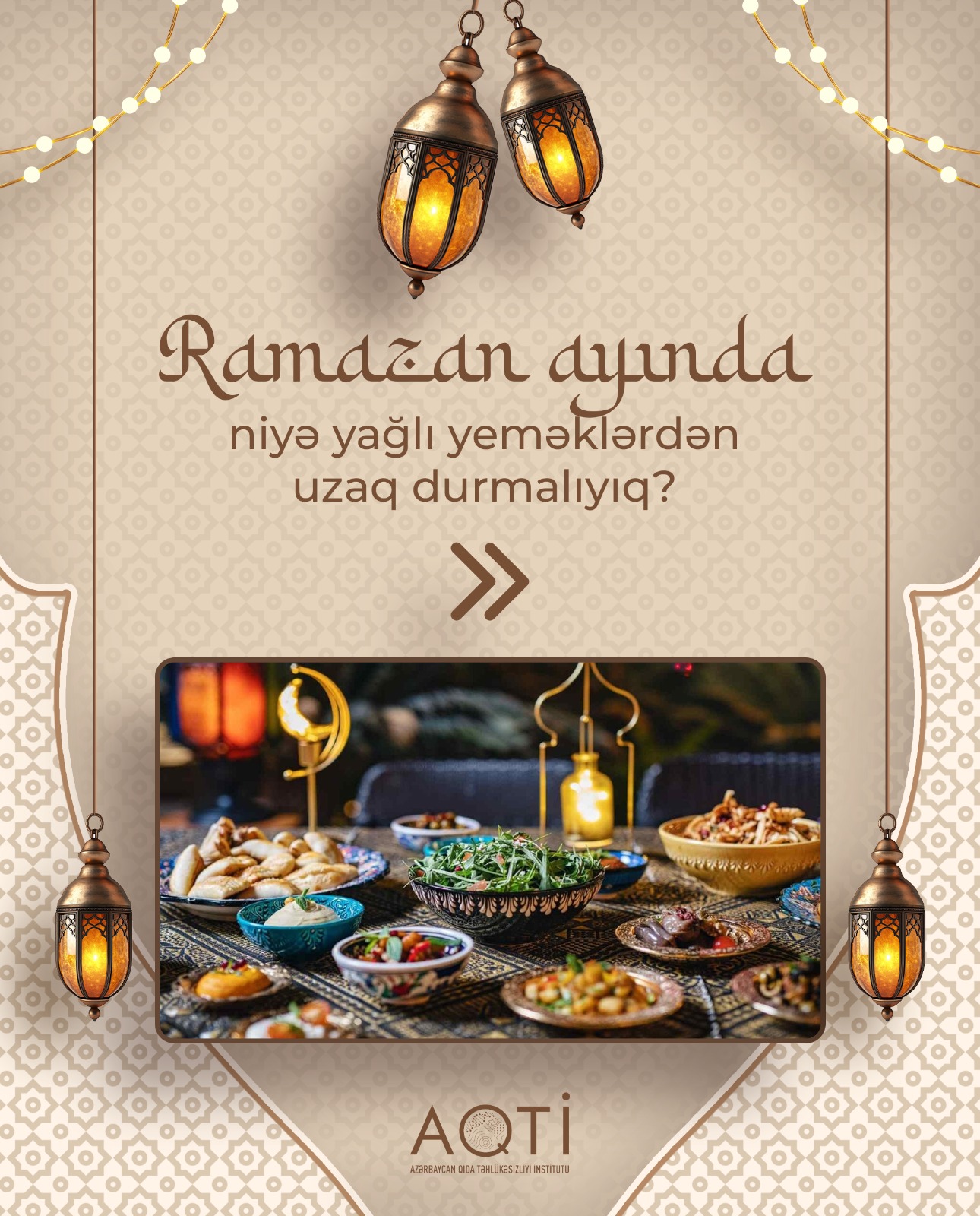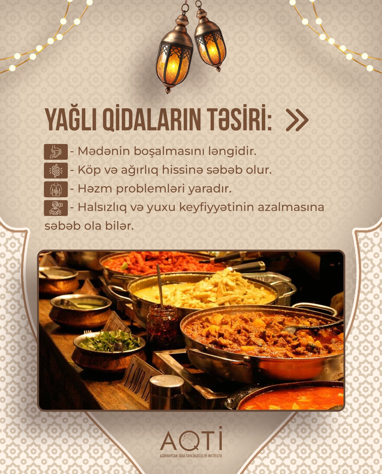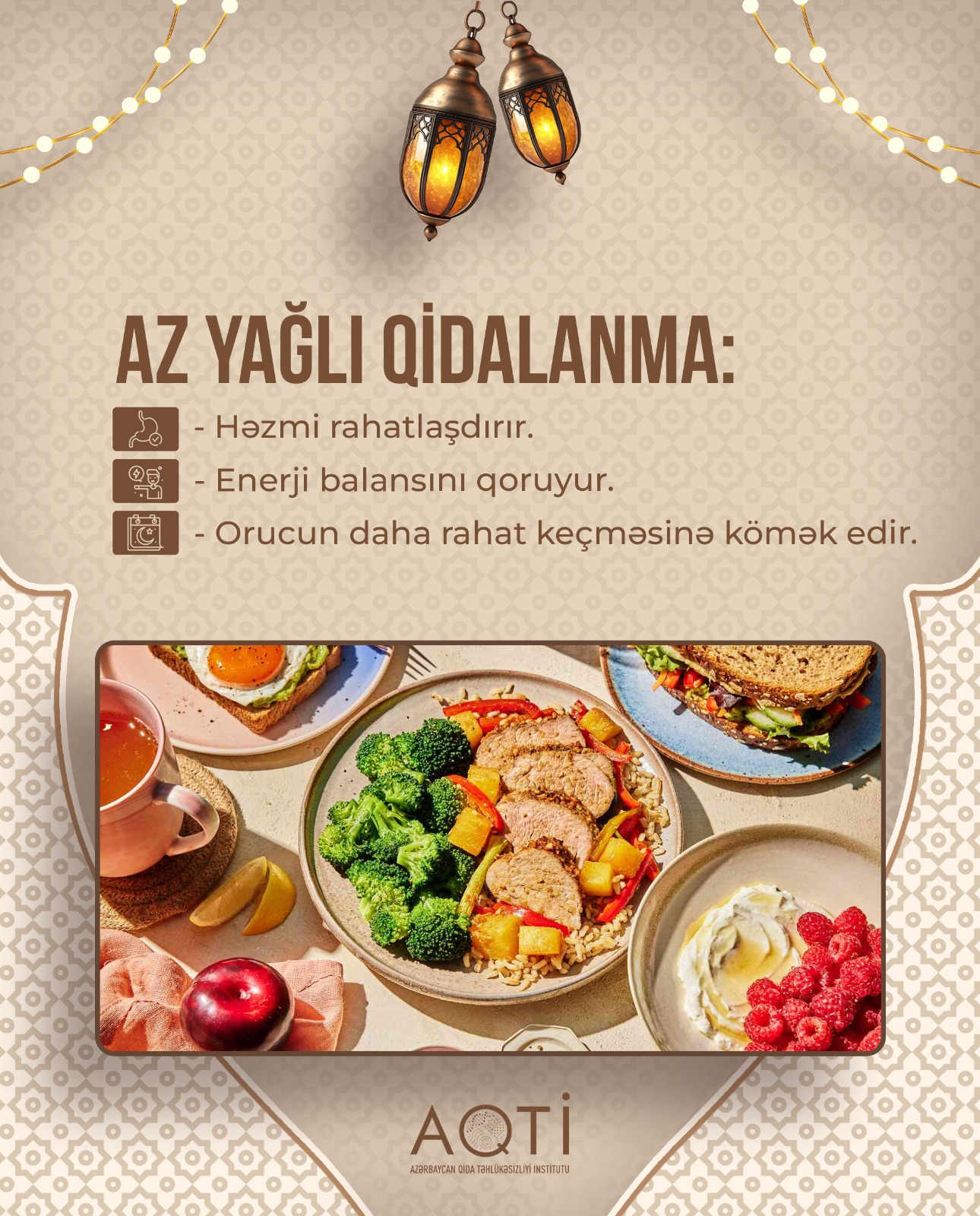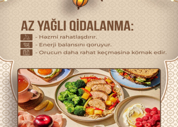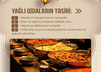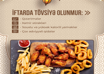 Foodinfo.az Azərbaycan Qida Təhlükəsizliyi İnstitutunun (AQTİ) məlumatlarına istinadla bildirir ki, iftar zamanı mümkün qədər az yağlı və yüngül yeməklərə üstünlük verilməlidir. Xəmir xörəkləri, qızardılmış yeməklər və müxtəlif souslarla yeməklər, yüksək kalorili qidaların iftar süfrəsində yer alması tövsiyə olunmur. Bu cür qidalar həzmi çətin və müəyyən dərəcədə ağırlıq hissi yaradır.