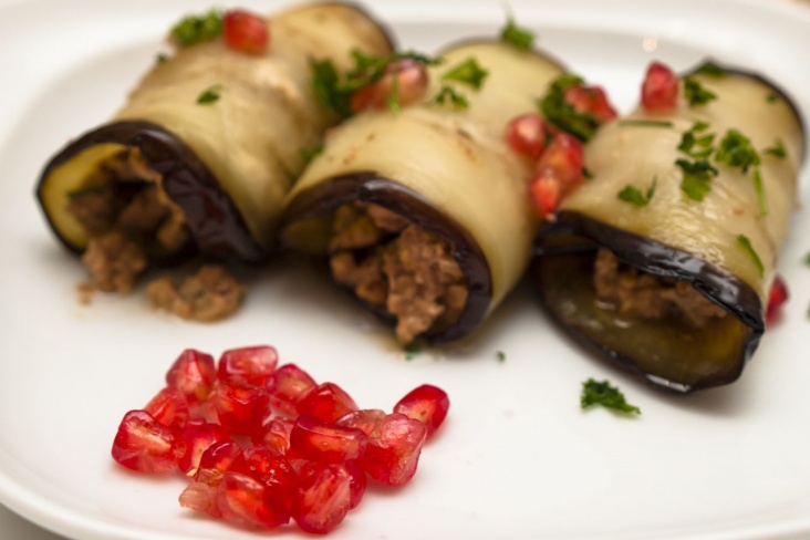 Balkabağı rulonları qozlu içliklə hazırlanır. Qoz, sarımsaq və göyərti pastasını sobada bişmiş badımcan dilimlərinə bükün. Bu yemək həm vizual olaraq cəlbedici, həm də sürətli hazırlanır – təxminən 20 dəqiqə çəkir.