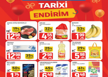 Endirimdə sümüklü dana döş əti 1 kiloqramı 12.99 manat, Hicaz təzə toyuq paket 1 kiloqram 4.55 manat, banan 1.99 manat, Pegah kərə yağı 1 kq 12.98 manat, Leya günəbaxan yağı 1 litr 2.98 manat, Tajdar Hindistan basmati düyü kisə 2 kiloqram 5.98 manat, Riçard çay 90 qram 1.74 manat, Ariel 3 kiloqram 9.48 manat olacaq. Qeyd edək ki, bu özəl kampaniya zamanı 300 çeşid gündəlik tələbat məhsulu 60 %-ə qədər endirimlə təklif olunacaq.