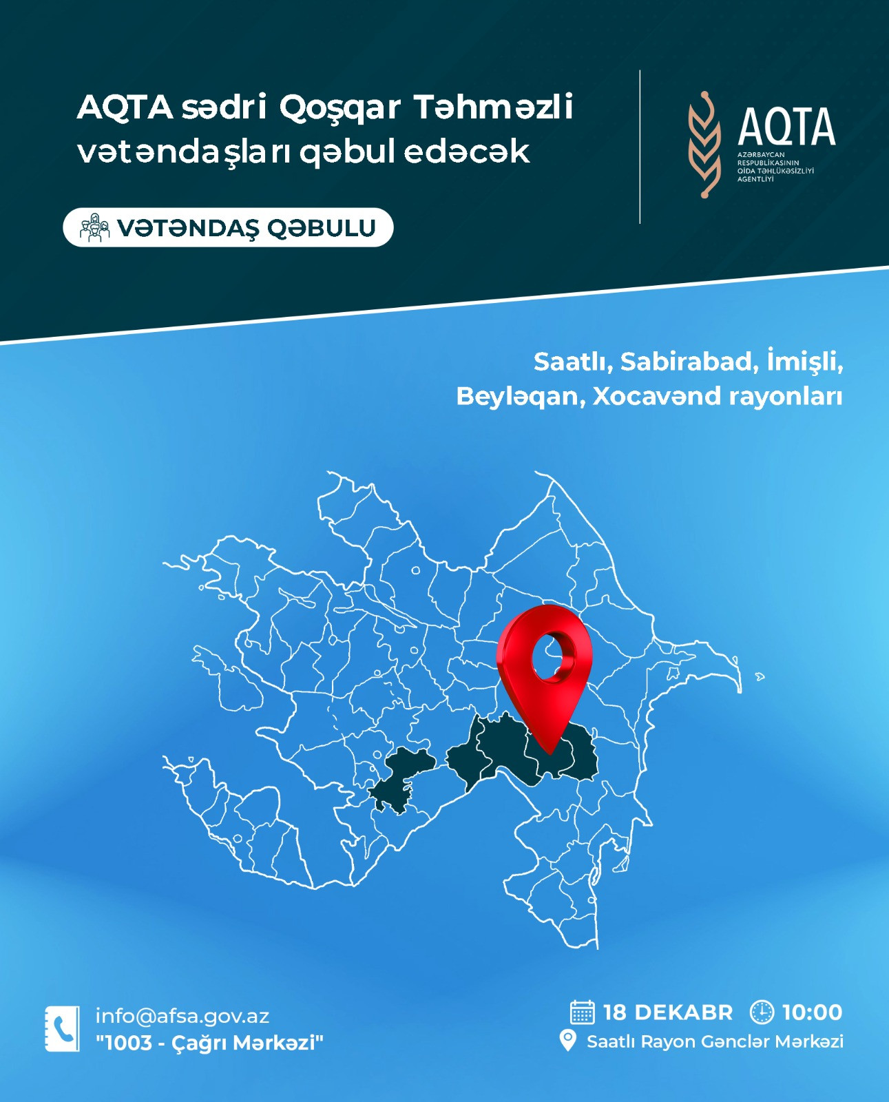 Qida Təhlükəsizliyi Agentliyinin sədri Qoşqar Təhməzli dekabrın 18-i saat 10:00-da Saatlı Rayon Gənclər Mərkəzində Saatlı, Sabirabad, İmişli, Beyləqan, Xocavənd rayonlarından olan vətəndaşların qəbulunu keçirəcək.
