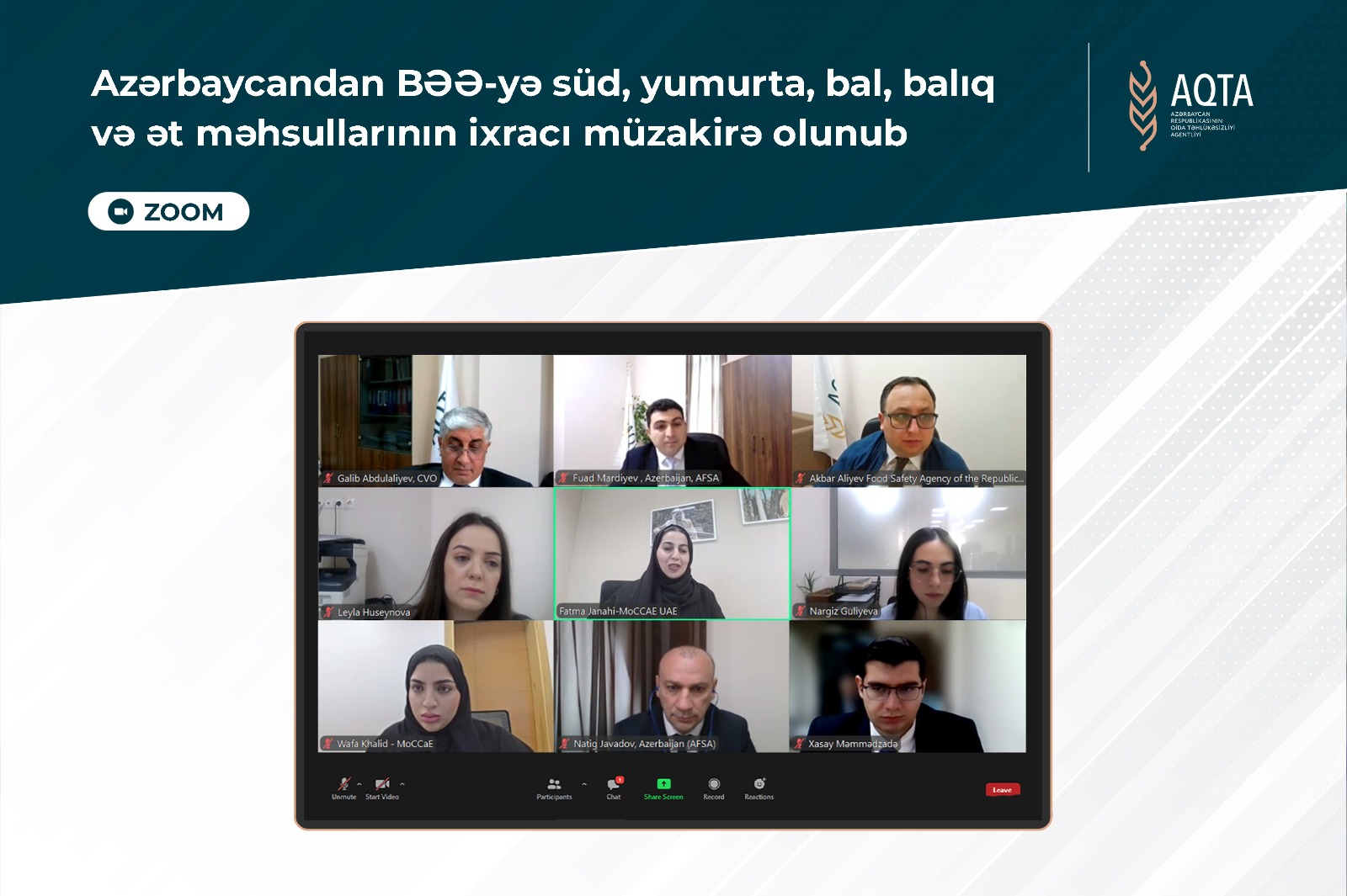 Azərbaycan Qida Təhlükəsizliyi Agentliyi (AQTA) və Birləşmiş Ərəb Əmirliklərinin (BƏƏ) İqlim Dəyişikliyi və Ətraf Mühit Nazirliyinin nümayəndələri arasında onlayn formatda görüş keçirilib.