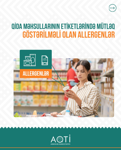 Qida məhsullarının tərkibində istifadə olunduğu halda allergen maddələr etiketdə mütləq qeyd edilməlidir. Həmin allergenlərə qlüten ehtiva edən taxıllar, xərçəngkimilər, molyusklar, yumurta, balıq, yer fındığı, soya, süd və süd məhsulları və digərləri daxildir.