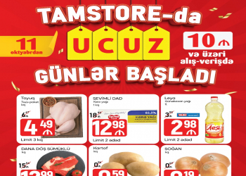 Tamstore Marketlər şəbəkəsi 13 oktyabrdan etibarən “Tamda ucuz günlər” kampaniyasına start verib. Kampaniya zamanı təzə toyuğun 1 kilosu 4.49 manat, təzə file 6.79 manat, yerli sümüklü dana ətinin 1 kilosu 12.99 manat, yerli sümüksüz dana əti 16.99 manat, Tajdar düyü 2 kiloluq kisə 5.50 manat, Sevimli Dad kərə yağının 1 kilosu 12.98 manat, Leya günəbaxan yağı 1 litir 2.98 manat, Soğan 19 qəpik, kartof 59 qəpik olacaq. Tamstore Marketlər Şəbəkəsi bütün qızrmızı ət çeşidlərinə meyvə və tərəvəzə, təzə toyuq məhsullarına tətbiq etdiyi bazardan ucuz qiymətlər strategiyasını uzunmüddətli etməyi planlaşdırıb. Qeyd edək ki, endirim digər məhsullardan 10 manatlıq alış-veriş etdikdən sonra keçərli olacaq. Endirimlər təbii ki, bununla yekunlaşmır. Mağazada 3200 çeşiddə məhsul müxtəlif endirimlərlə təklif olunacaq.