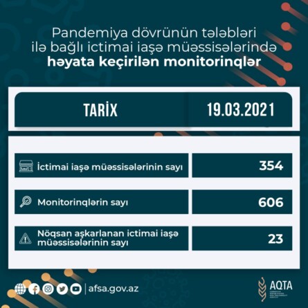 Foodinfo.az xəbər verir ki, nəzarət tədbirləri çərçivəsində 19 mart 2021-ci il tarixində ölkə üzrə 354 ictimai iaşə obyektində 606 monitorinq keçirilib. Monitorinqlər zamanı 23 müəssisədə qanunvericiliyin tələblərinin kobud şəkildə pozulması faktları aşkar olunub. Aşkar olunmuş nöqsanlarla bağlı İnzibati Xətalar Məcəlləsinə uyğun olaraq müvafiq tədbirlər görülüb.