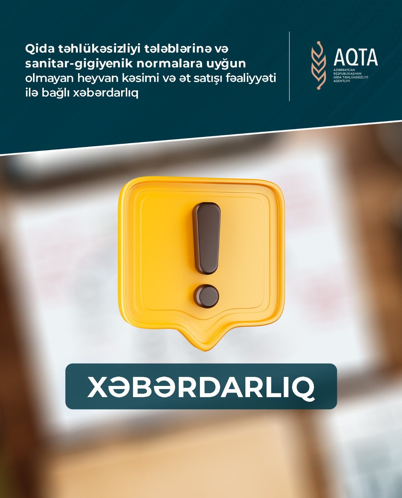 “Heyvan kəsimi fəaliyyətinin tənzimlənməsi haqqında” Azərbaycan Respublikası Prezidentinin 11 iyun 2018-ci il tarixli 199 nömrəli Sərəncamının icrası ilə əlaqədar olaraq, Qida Təhlükəsizliyi Agentliyi baytarlıq-sanitariya və gigiyena normalarına cavab verməyən yerlərdə, küçələrdə, yol kənarlarında qanunsuz heyvan kəsimi və ət satışı fəaliyyəti ilə məşğul olan şəxslərə xəbərdarlıq edir.